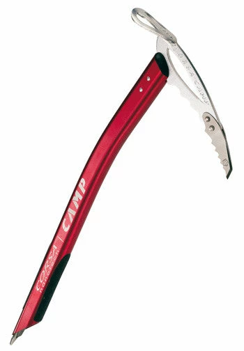 The most advanced mountaineering ice axe on the market. Employs the same 7075-T6 aluminum alloy as the hyperlight Corsa, but features innovative Sandvik Nanoflex® steel (see page 26) reinforcements on the pick and spike. The steel components dramatically increase the durability and strength of these critical points without significantly increasing the weight of the axe. In addition, the Corsa Nanotech has an aggressive single-curve shaft that provides better clearance without interfering with walking or plunging performance. Can be fit with either the sliding leash (1305) for mountaineering or the Alpina leash (1304) for alpine climbing.