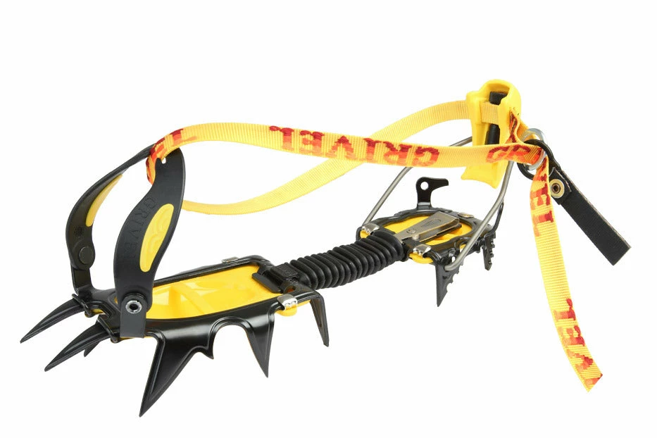 An evolution of the Cramp-O-Matic system which utilises the C-O-M rear bale and lever. The plastic harness system is hinged from two front posts which retain the boot securely even if it has a shallow, worn front welt or overboots are being used. It is a simple and efficient binding, being far more versatile than the original Cramp-O-Matic style. Made in dual-component plastic: the black part is stronger, bearing the strain whilst the yellow part is softer, increasing adherence to the boot. The harness is made from the strongest, most durable plastic available -Zytel DuPont, which was developed for the manufacture of alpine ski bindings. Obviously it cannot last forever, so please, after long and severe use replace the harness the same way you would resole trekking boots or rock climbing shoes.