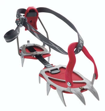 Sturdy and affordable steel crampons with flexible linking bars that adapt precisely while walking on snow and ice. Semi-automatic bindings fit most semi-rigid mountaineering boots (requires a welted heel).