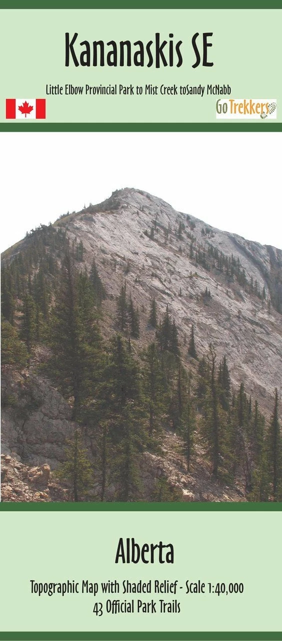 Topographic map with shading by GoTrekkers of Kananaskis SE, AB at 1:40,000. This map is about 41″ x 39″ single sided showing 52 Offical Park trails in the Kananaskis SE area