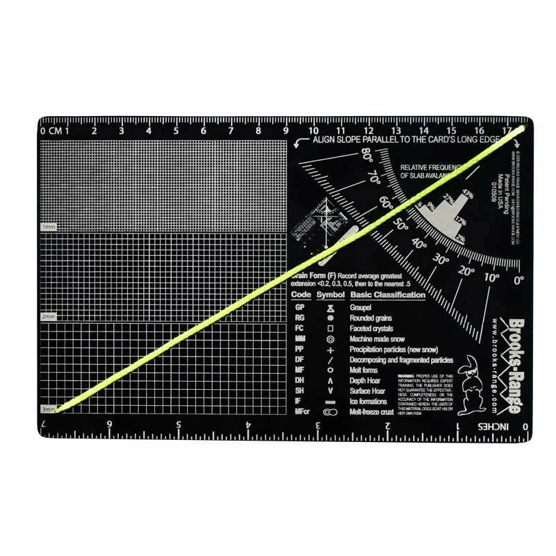 Dimensions and guidelines for performing Rutschblock, Stuffblock, Compression, and Shovel Shear Tests are etched on the backside. Snow crystal terminology is etched on the front side to aid in proper recording of conditions in a field book.